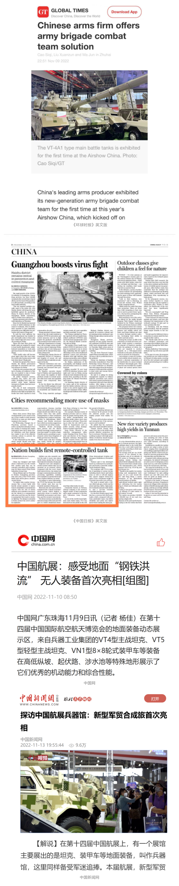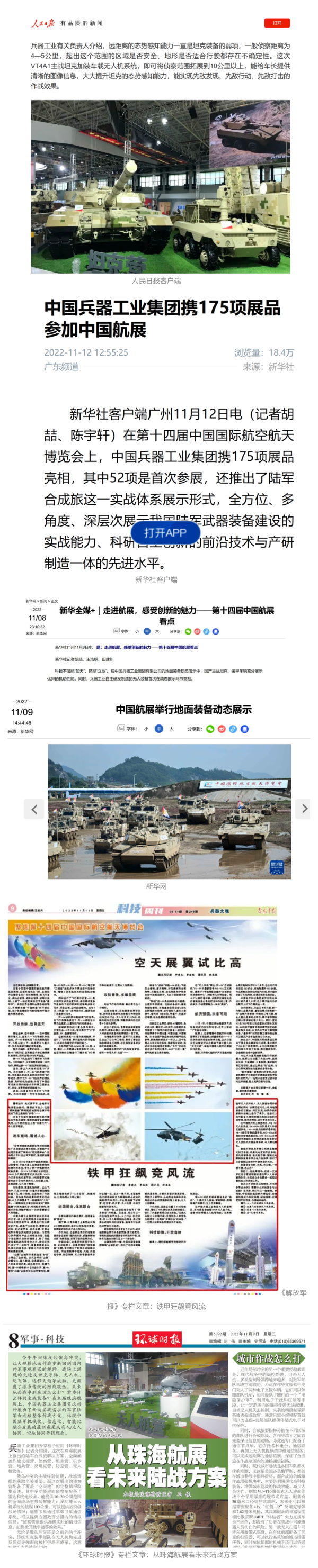 央視國防軍事頻道航展特別報道《炫舞天地間》11月12日《賞“鐵甲雄風(fēng)”!看航展地面裝備“鋼鐵洪流”名場面》對兵器工業(yè)集團(tuán)武器裝備特色亮點進(jìn)行報道?!秶儡娛略鐖蟆?1月7日推出報道《第十四屆中國國際航空航天博覽會明天開幕 中國兵器館首次以陸軍合成旅實戰(zhàn)體系形式展出》,對兵器館陸軍合成旅實戰(zhàn)體系進(jìn)行報道?!盾娛聢蟮馈?1月9日推出《第十四屆中國國際航空航天博覽會 地面兵器裝備首次聯(lián)合陸航直升機(jī)進(jìn)行動態(tài)展示》報道?!盾娒孕刑煜隆?1月9日推出報道《軍迷打卡航展2022》以專業(yè)軍迷視角探館兵器館,全面展示兵器工業(yè)集團(tuán)參展裝備特色亮點。