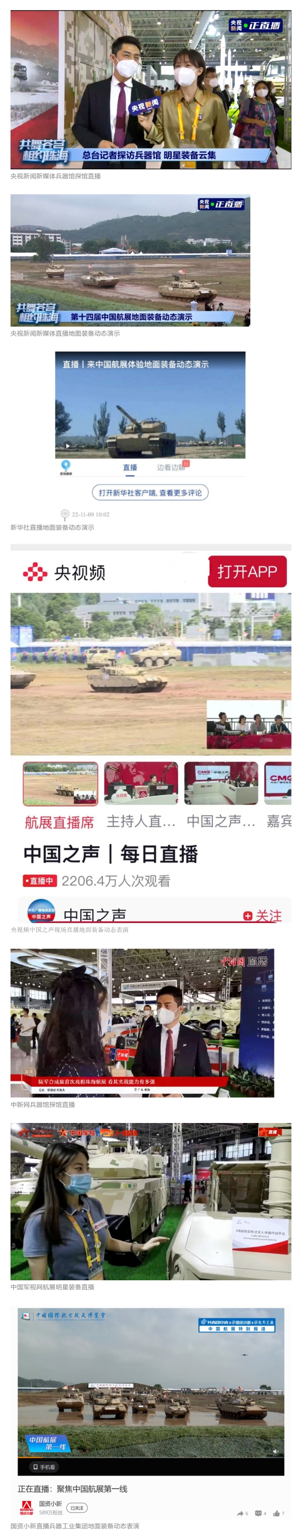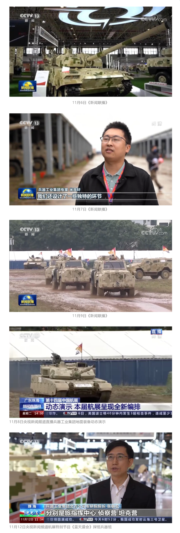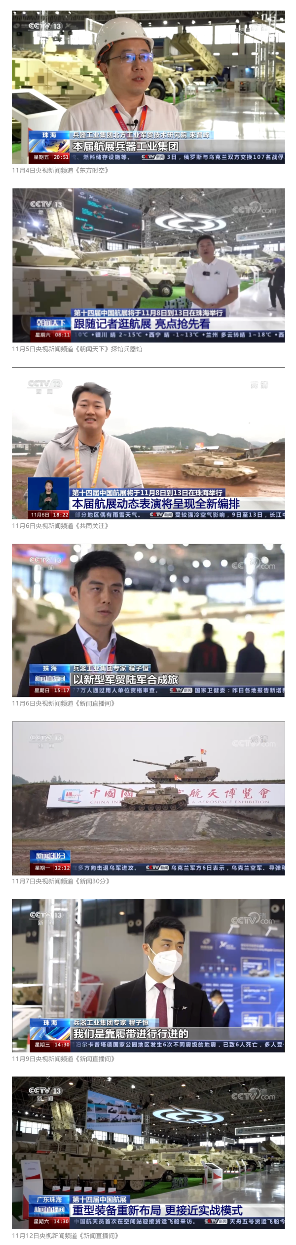 此次航展,央視新聞頻道《朝聞天下》《新聞直播間》《東方時空》《共同關(guān)注》《新聞30分》《24小時》、央視國防軍事頻道《國防軍事早報》《軍事報道》《軍迷行天下》、央視國際頻道《中國新聞》《今日環(huán)球》等欄目共播出兵器工業(yè)集團(tuán)參展相關(guān)新聞報道30余條。